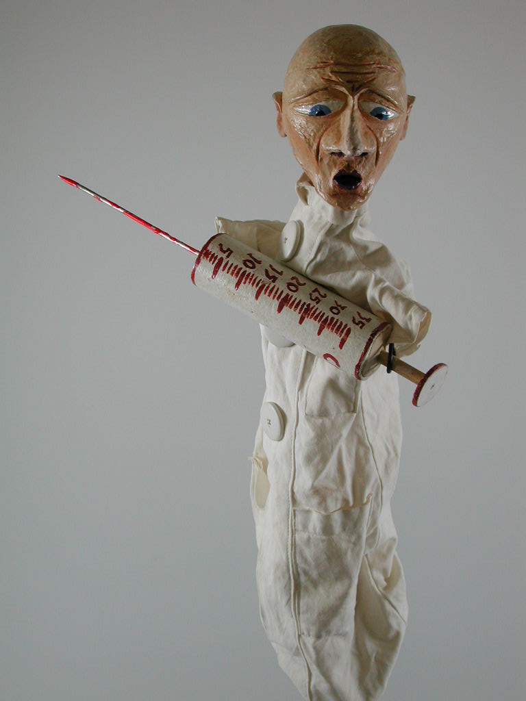 Pop van dokter met grote injectiespuit. Jasschort met zakken en drie grote witte knopen van wit katoen.- Trefwoorden