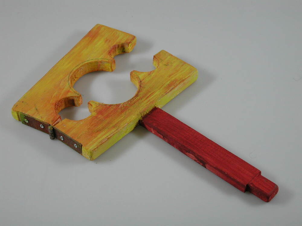 Houten schandpaal, geel en rood-oranje geverfd. Met vastgeschroefde stalen scharnier.- Trefwoorden