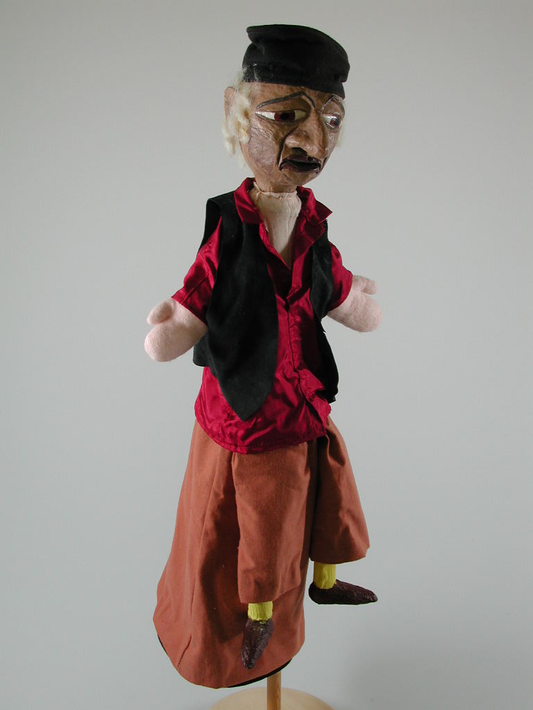 Pop van treurig kijkende man met Turks of Perzisch uiterlijk. Op kop staat muts van zwart katoen. Rood zijden blouse, zwart suède mouwloos vest. Broek van bruin katoen.- Trefwoorden