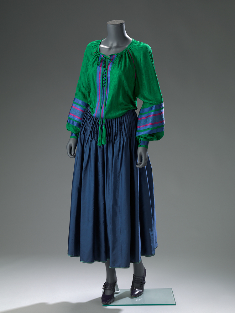 Wijd uitlopende vierbaans rok van donkerblauwe zijde. Op heuphoogte tot taille heeft gehele rok smalle verticaal gestikte plooien (16 cm lang). Zoom is afgewerkt met groen zijden band. Gevoerd met blauwe voeringzijde.
