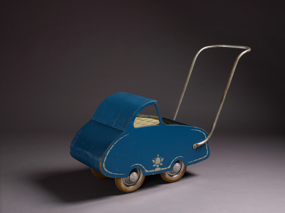 Deze poppenwagen is afkomstig uit de vliegtuigfabriek Fokker in Amsterdam-Noord. Vliegtuigfanaat Anthony Fokker richtte op meerdere plekken zijn vliegtuigfabrieken op en groeide in de jaren ’20 uit tot de grootste vliegtuigbouwer ter wereld. Het bedrijf bood ook veel werkgelegenheid: maar liefst 4100 mensen waren werkzaam in de fabriek in Amsterdam-Noord. Tijdens het Sinterklaasfeest van 1945 of 1946 werden er van afvalmaterialen uit de vliegtuigbouw cadeaus gemaakt voor de kinderen van een aantal werknemers: poppenwagens voor de meisjes, meccano voor de jongens. ( Quirine van Aerts)