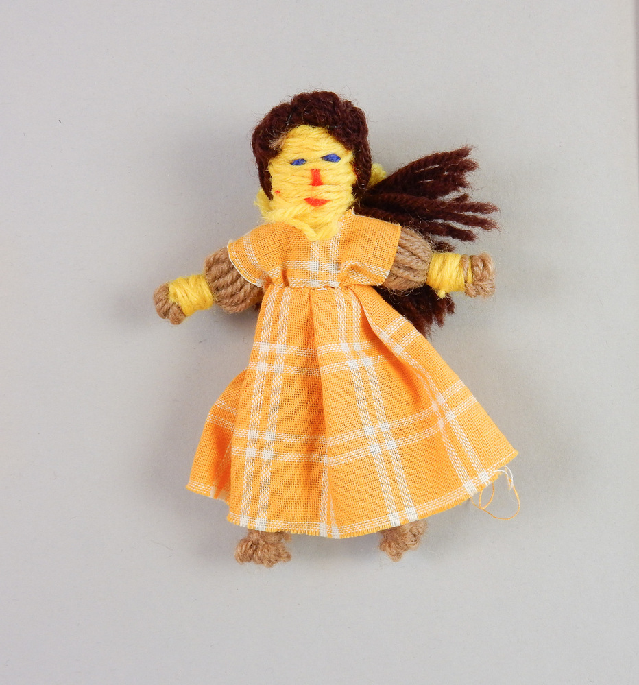 Pop in vorm van meisje, gemaakt van bundels leverkleurige wollen draad. Met katoenen jurk met geel-witte ruit.- Trefwoorden