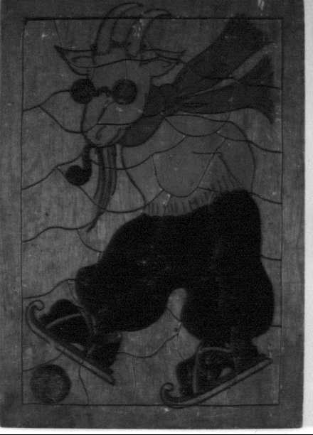Rechthoekig plankje. Voorstelling: schaatsende geit met bril en pijp, rode das, paarse broek- Trefwoorden