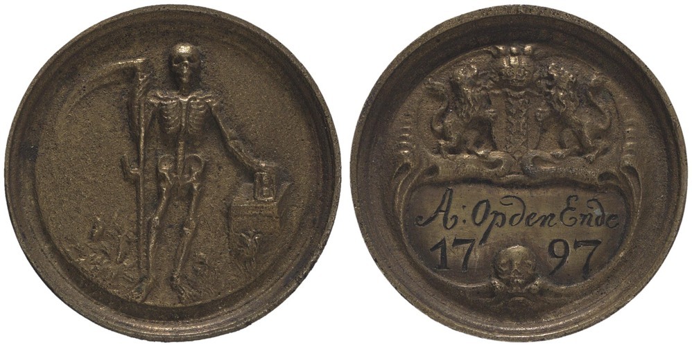 keerzijde: Het gekroonde wapen van Amsterdam, gehouden door twee leeuwen. Daaronder een cartouchte met doodshoofd. In de cartouche een naam en datum.