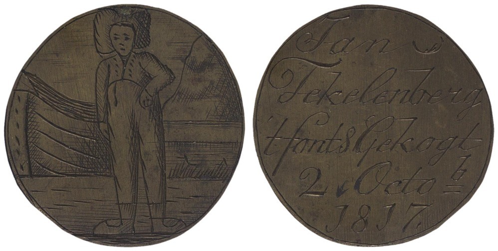 voorzijde: binnen een cirkelgroef een korendrager staand en face, linkerhand op de heup, links een voorsteven van een schuit. keerzijde: binnen een cirkelgroef een naam en datum.