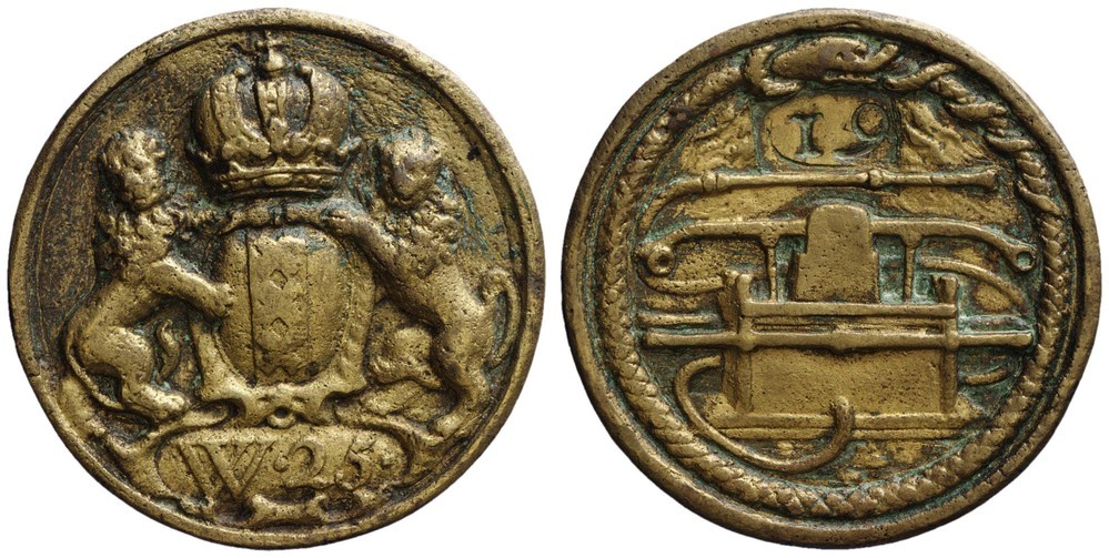 voorzijde: het gekroonde wapen van Amsterdam, gehouden door twee leeuwen. Onder het wapen een veld met W.25. keerzijde: een afbeelding van een brandspuit omgeven door een Ouroboros, bovenin een nummer.- Trefwoorden