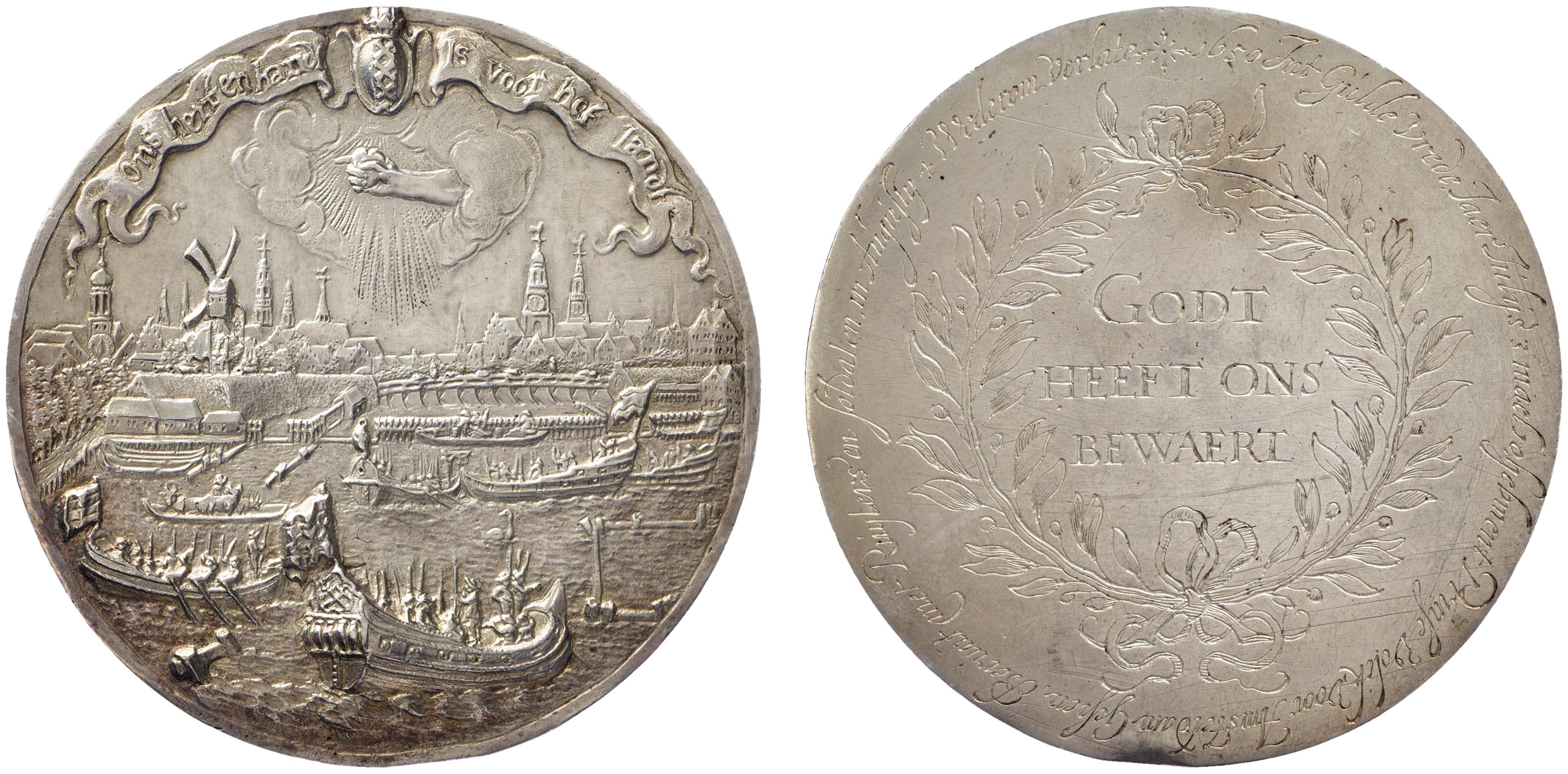 voorzijde: gezicht op Amsterdam vanaf de Amstel. Schepen met bewapende bemanning. Uit de wolken een arm, met een hart in de hand. Daarboven het wapen van Amsterdam in een banderol waarop een inscriptie.