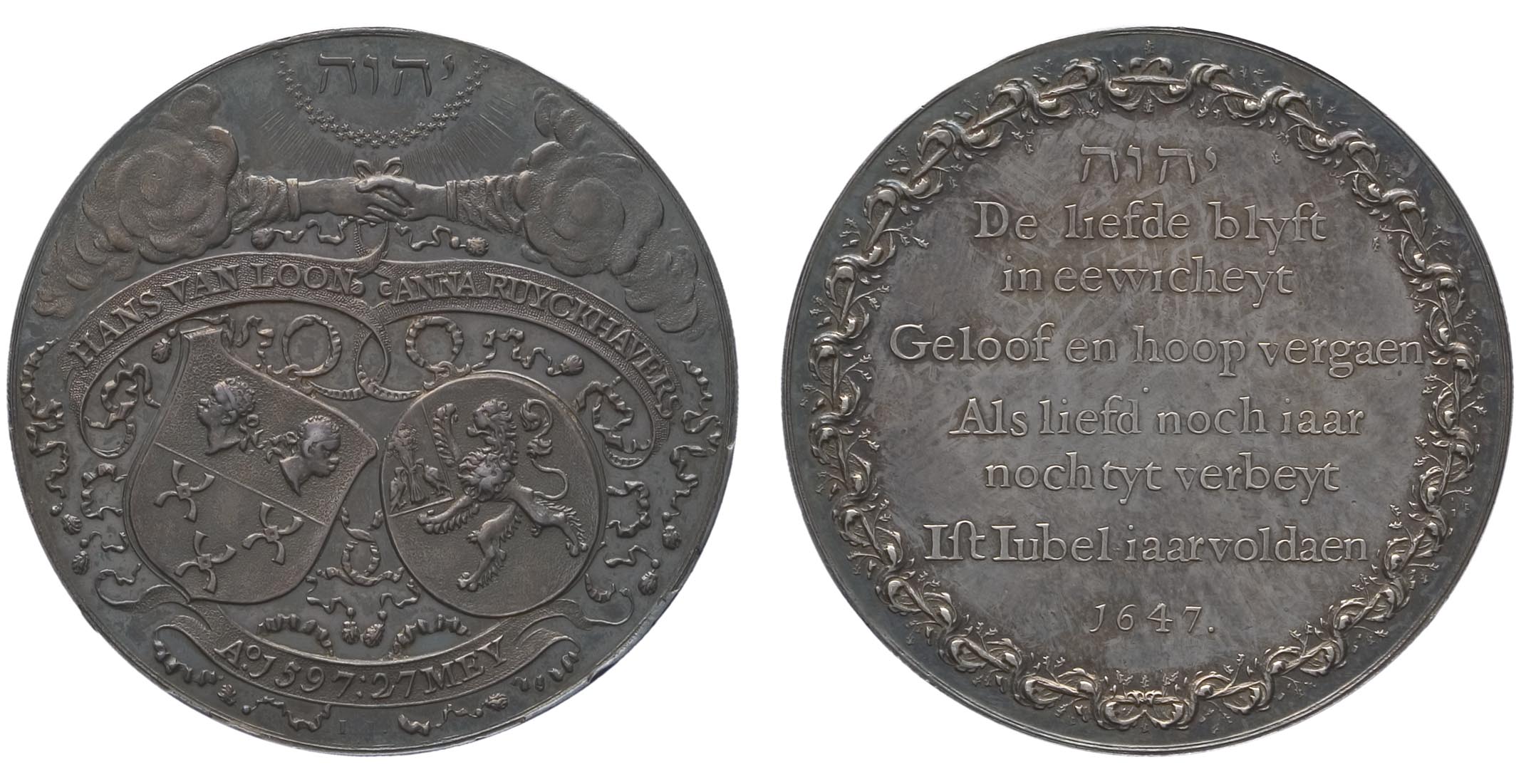 Aan de voorzijde van deze zilveren penning houden twee uit de wolken komende in elkaar geslagen handen de wapenschilden van het gouden bruidspaar vast. Aan de keerzijde staat ‘De liefde blyft / in eewicheyt / Geloof en hoop vergaen / Als liefd noch iaar / noch tyt verbeyt / Ist Iubel iaar voldaen / 1647’. Zowel aan de voor- als keerzijde staat helemaal bovenaan ‘Jehova’ in het Hebreeuws.
