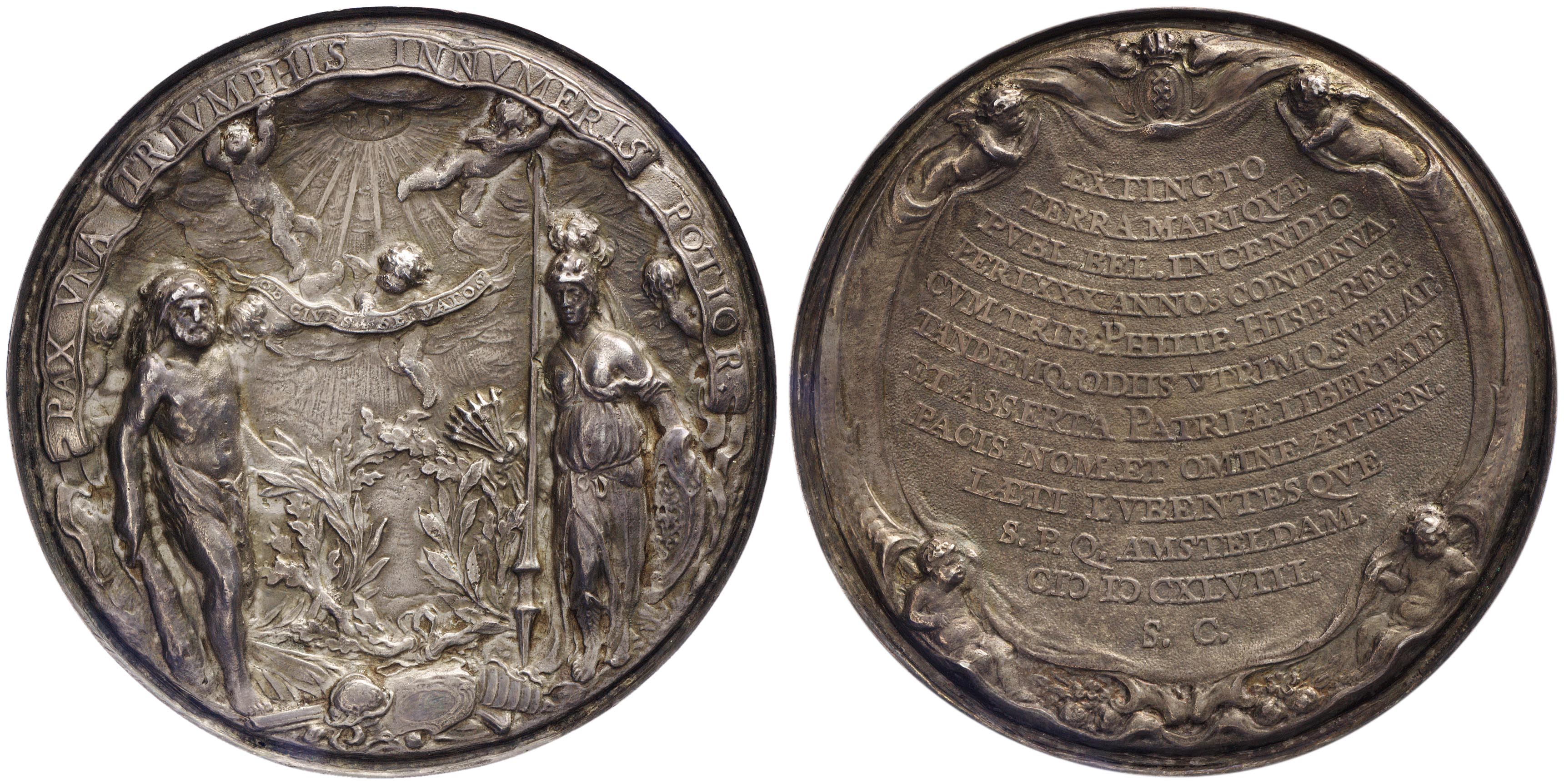 opschrift keerzijde, onder het gekroonde wapen van Amsterdam: EXTINCTO / TERRA MARIQUE / PUBL. BEL. INCENDIO / PER LXXX ANNOS CONTINVA. / CVMTRIB. PHILIP. HISP. REG. / TANDEMQ. ODIIS UTRIMQ. SVBLAT. / ET ASSERTA. PATRIAE LIBERTATE / PACIS NOM. ET OMINE AETERN. / LAETI LVBENTESQUE S.P.Q. AMSTELDAM. MDCXLVIII. / S.C.