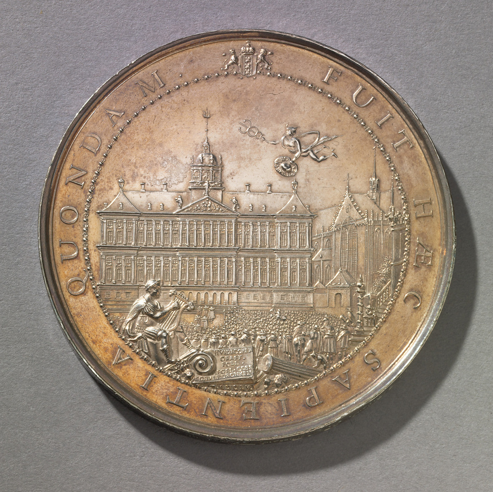 Voorzijde: het nieuwe stadhuis met rechts de Nieuwe Kerk. Op de Dam een mensenmenigte en feestelijke optocht. Linkervoorgrond Amphion met zijn lier, zittend op de resten van een ruïne; rechts daarvan een steen met daarop de namen van de vier burgemeesters in 1655 en de twee thesauriërs in 1655, daarnaast een omgevallen sokkel en portretkop uit de oudheid. Op de sokkel staat een hond. In de lucht zweeft de handelsgod Mercurius met in zijn rechterhand zijn slangenstaf en in zijn linker de vrijheidshoed. Midden boven het stadswapen tussen twee leeuwen.