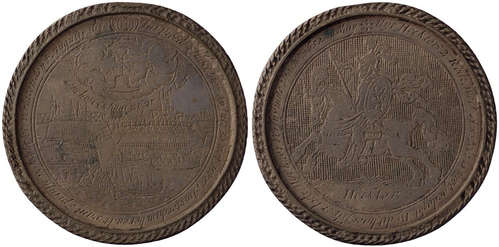 omschrift keerzijde: Uyt Hecktors 2 Rodt, wert Amstels Staet gedaght. By dit haer silver lodt Uijt haer Versúymde Wacht. 1654 in Maij