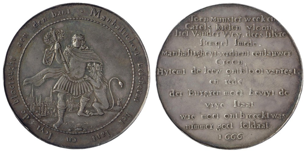 opschrift keerzijde: Toen Munster week en / Carels Kielen vloon, / liet Vander Wey dees sil'vre / Stempel Smede. / Manhaftigheyt verdient een lauwer / Croon, / Hy temt de leew ontbloot van regt, / en rede / der Burgren moet bevryt de / vrye Staat / wie moet ontbreeckt was / nimmer goet Soldaat. / 1666