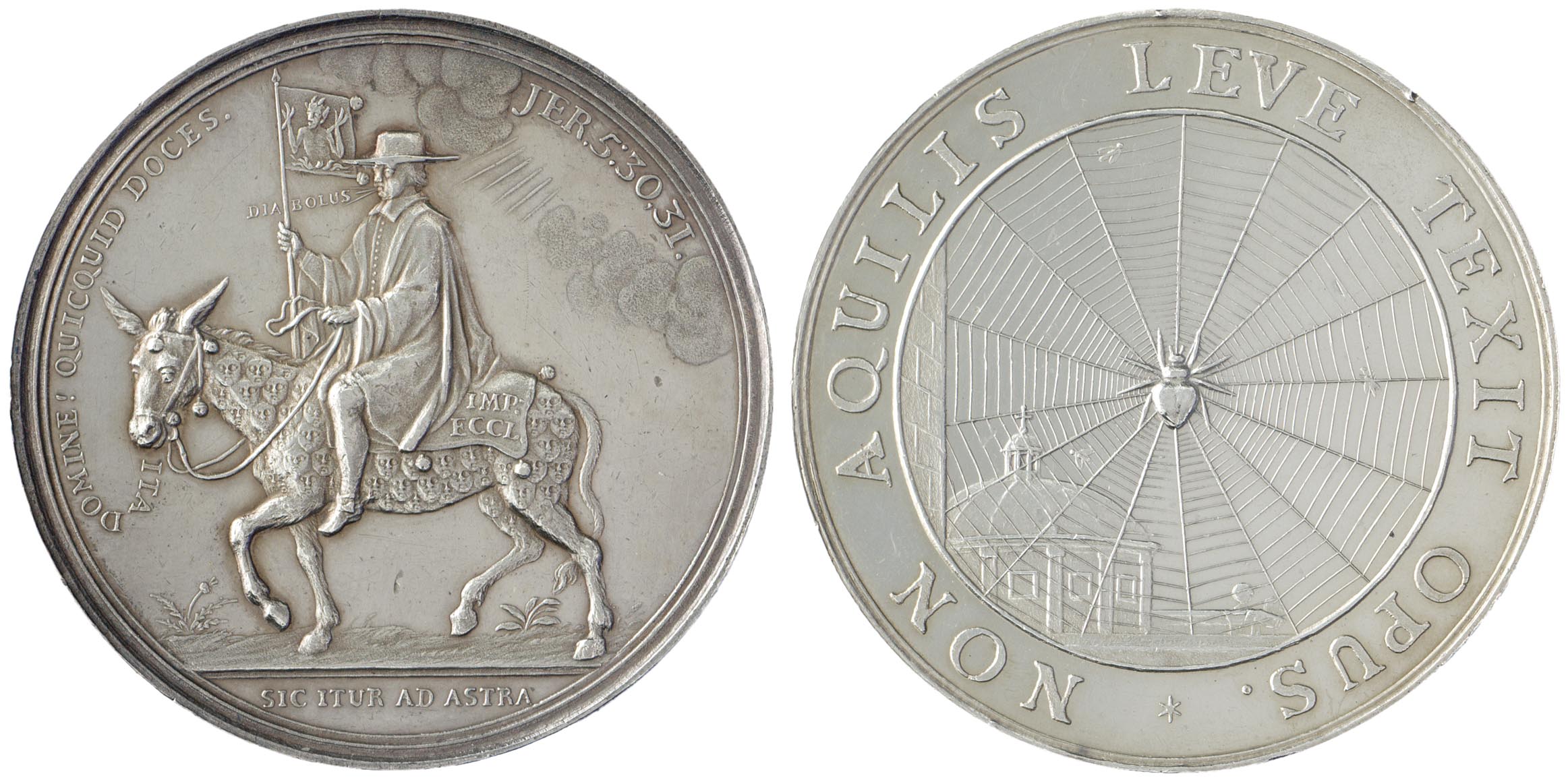 voorzijde: in een omschrift en dubbele rand ds Jacobus Koelman op een met mensenhoofden beschilderde ezel (de domme menigte), met een Satansbanier in de hand. Uit zijn mond rolt de tekst: DIABOLUS. Uit de ezelsbek rolt de tekst: ITA DOMINEI QUICQUID DOCES. Rechtsboven in de rand de tekst: JER.5:30.31. In de afsnede: SIC ITUR AD ASTRA. Op het dekkleed van de ezel de tekst: IMP: ECCL.