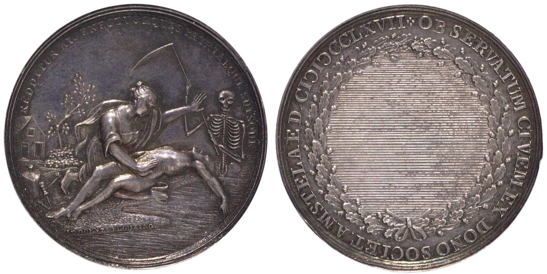 omschrift keerzijde: OB SERVATUM CIVEM. EX DONO SOCIET. AMSTELAED. CIƆIƆCCLXVII