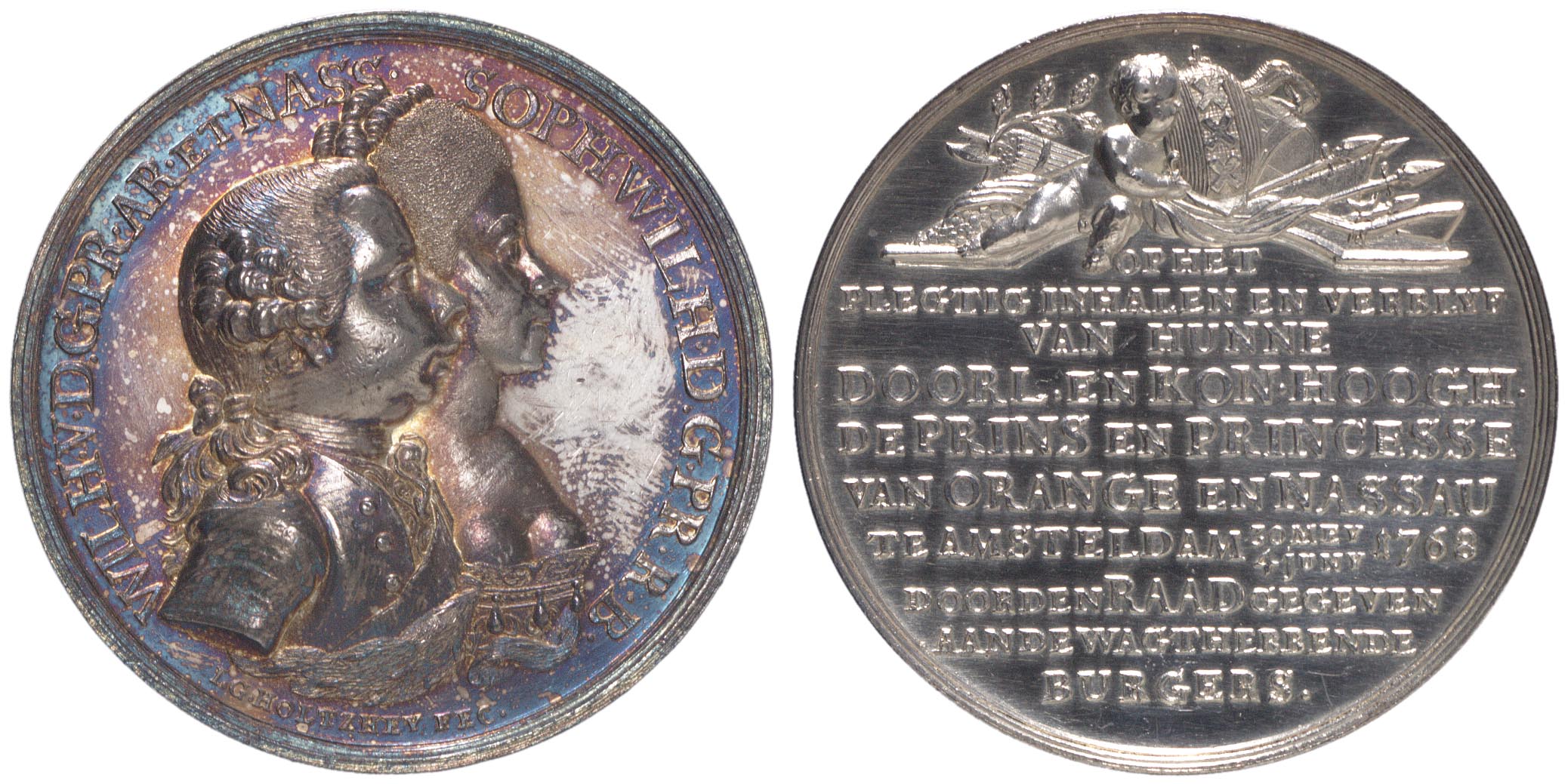 opschrift keerzijde: OP HET / PLEGTIG INHALEN EN VERBLYF / VAN HUNNE / DOORL. EN KON. HOOGH. / DE PRINS EN PRINCESSE / VAN ORANGE EN NASSAU / TE AMSTERDAM 30 MEY-1 JUNY 1768 / DOOR DEN RAAD GEGEVEN / AAN DE WAGTHEBBENDE / BURGERS.