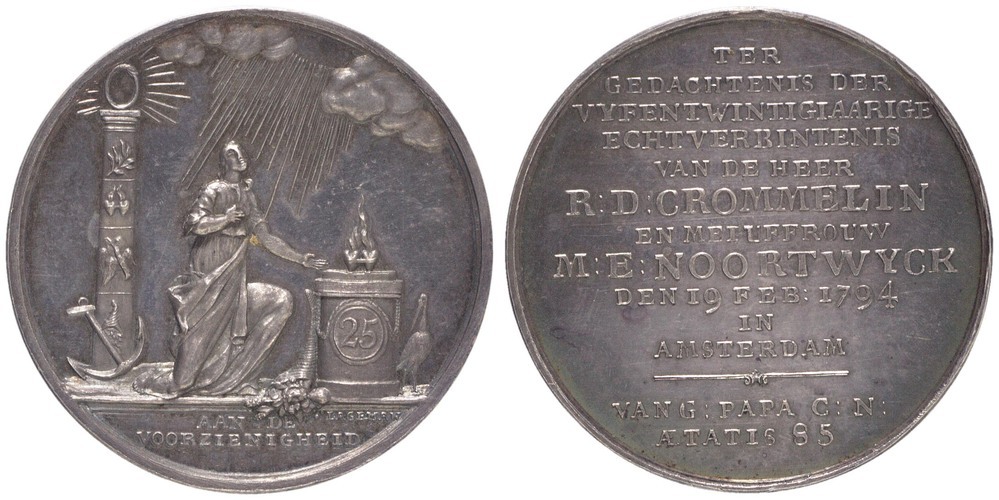 opschrift keerzijde: TER / GEDACHTENIS DER / VYFENTWINIGIAARIGE / ECHTVERBINTENIS / VAN DE HEER R: D: CROMMELIN / EN MEIUFFROUW / M: E: NOORTWYCK / DEN 19 FEB: 1794 / IN / AMSTERDAM