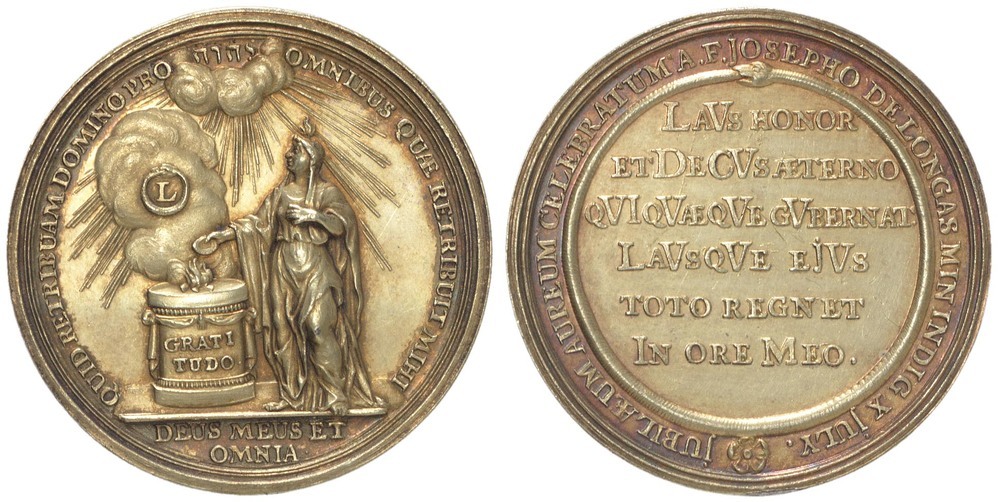 omschrift keerzijde: JUBILAEUM AUREUM CELEBRATUM A.F.JOSEPHO DE LONGAS MININ DIG X JULY.