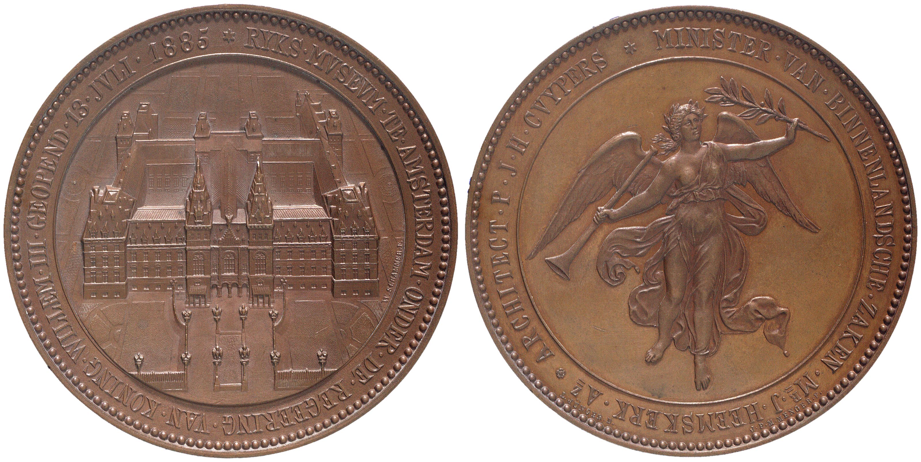omschrift voorzijde: *RIJKSMUSEUM . TE . AMSTERDAM . ONDER . DE . REGERING . VAN . KONING . WILLEM . III . GEOPEND . 13 . JVLI . 1885
