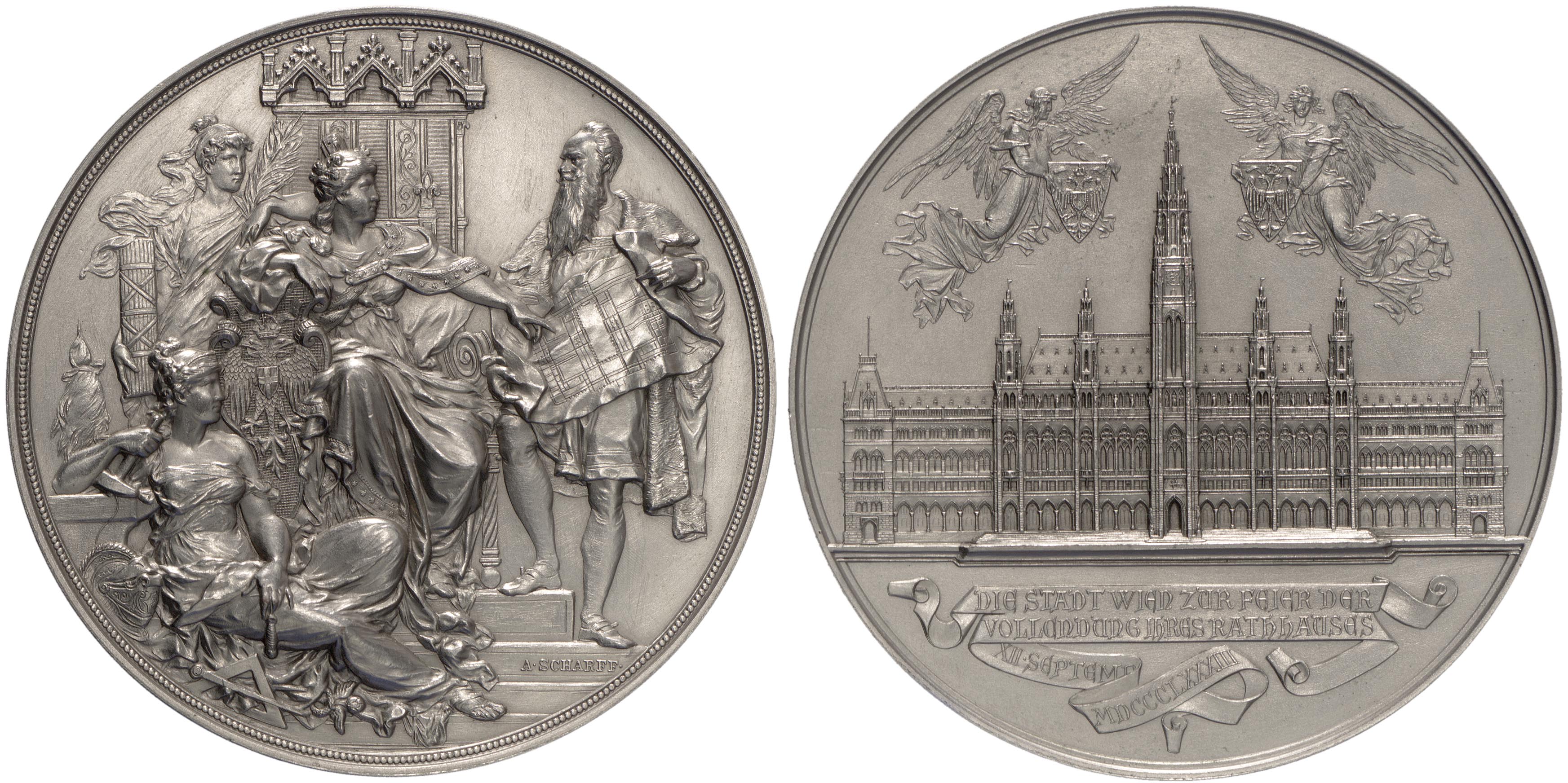 voorzijde: in een parelcirkel zit centraal de stedenmaagd in lang gewaad met muurkroon op haar hoofd op een zetel, terwijl ze met haar rechterarm rust op het stadswapen van Wenen. Links houdt een vrouw symbolisch een pijlenbundel in haar rechterarm (eenheid en eendracht) en in haar linkerhand een palmtak (overwinning). Rechts staat de architect met lange baard met een plattegrond in zijn handen voor het te ontwerpen nieuwe Weense stadhuis waarop de stedenmaagd met haar linkerhand iets aanwijst. Onder hem op een trede staat een signatuur. Linksonder zit vrouwe Bouwkunst met haar rechterarm leunend op een aambeeld met een hamer in haar rechterhand, met attributen als passer, driehoek, schietlood, helm en Mercuriusstaf.