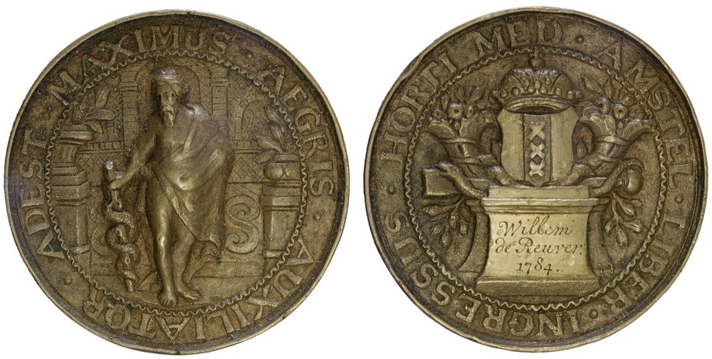 voorzijde: Aesculapius met zijn staf; achter hem een gebouw, links en rechts vazen met planten. Voorzien van een omschrift.
