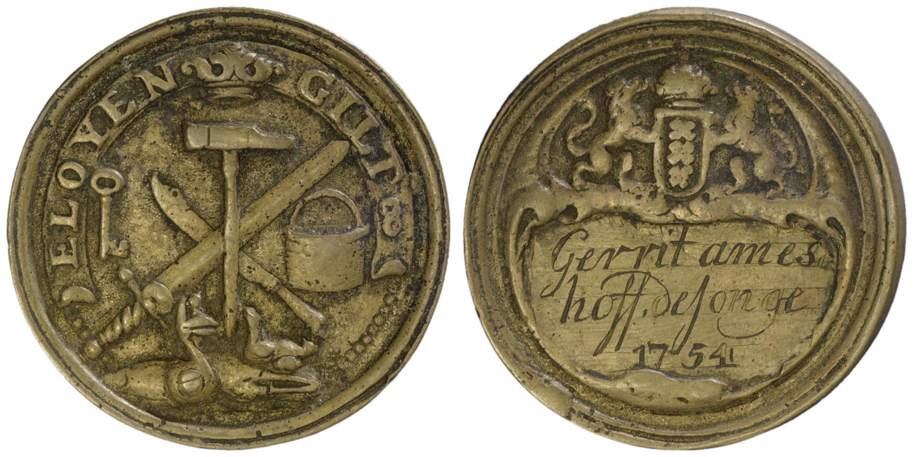 keerzijde: een omschrift waar bovenin een kroon. Onder de kroon een hamer, zwaard, mes, emmer, sleutel en geweerslot.