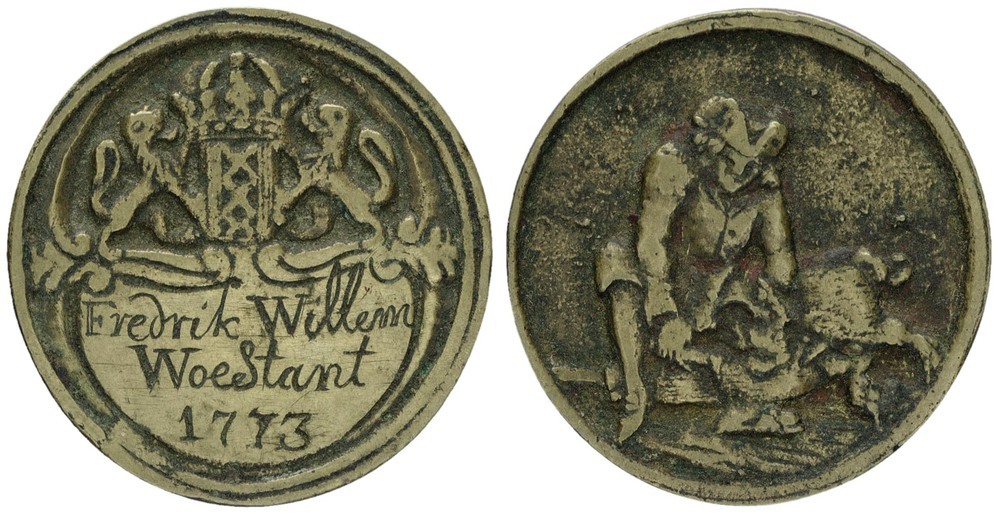 voorzijde: het gekroonde wapen van Amsterdam, gehouden door 2 leeuwen. Daaronder een schild, waarop een naam staat gegraveerd met jaartal.