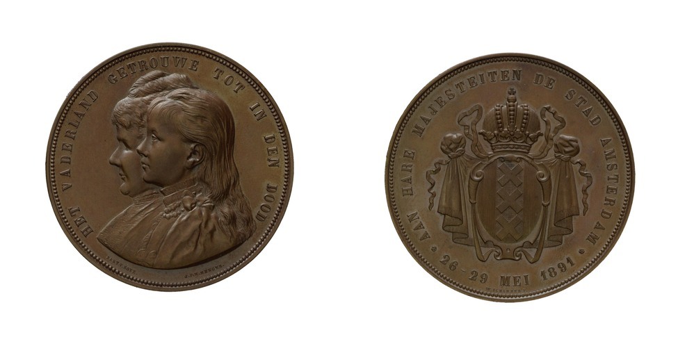 omschrift keerzijde: AAN HARE MAJESTEITEN / DE STAD AMSTERDAM * 26-29 MEI 1891 *