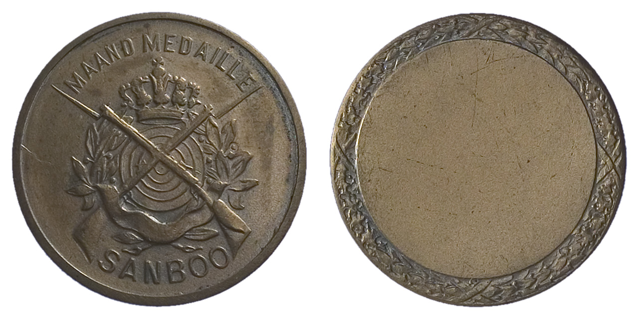 voorzijde: bovenaan een omschrift, waaronder een gekroonde ringschijf waar kruislings overheen twee geweren. Aan weerszijden een lauwertak en onderaan een lint. Geheel onderaan een opschrift.