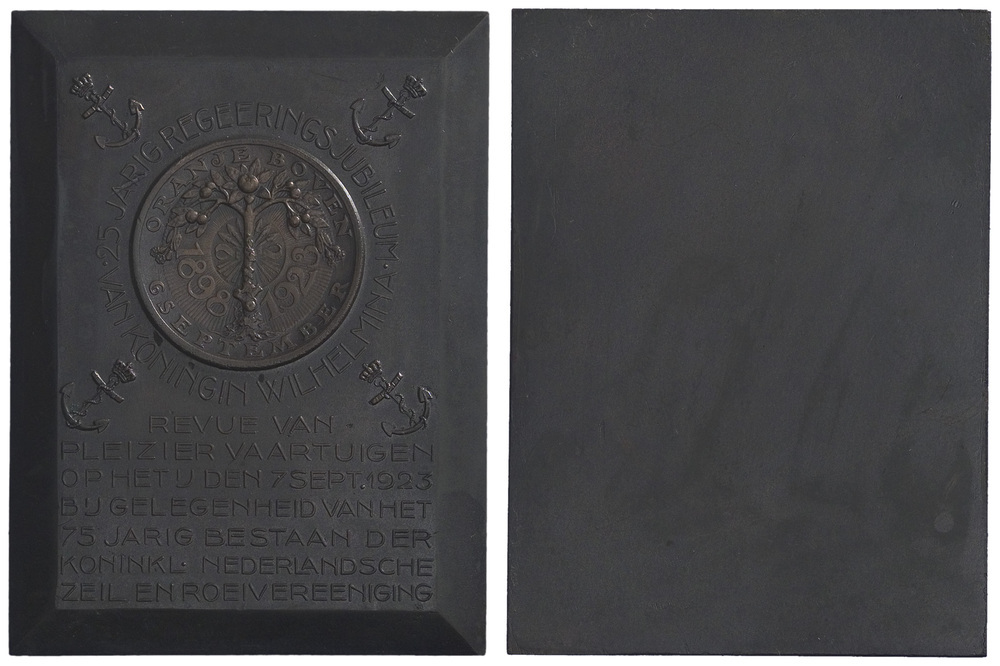 opschrift voorzijde onder: REVUE VAN / PLEZIER VAARTUIGEN / OP HET IJ DEN 7 SEPT. 1923 / BIJ GELEGENHEID VAN HET / 75 JARIG BESTAAN DER / KONINKL. NEDERLANDSCHE / ZEIL EN ROEIVEREENIGING