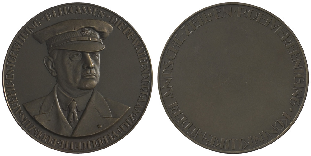 Prijspenning van de Koninklijke Nederlandse zeil- en roeivereniging, 1934 brons hoogte: 7 cm; breedte: 7 cm; diepte: 0.6 cm; gewicht: 126.85 gr; omschrift voorzijde: -P.L.LUCASSEN- DIE.DE.WATERSPORT.AAN.ZICH.VERPLICHTTE.DOOR.ZIJN.ARBEID.EN.TOEWIJDING