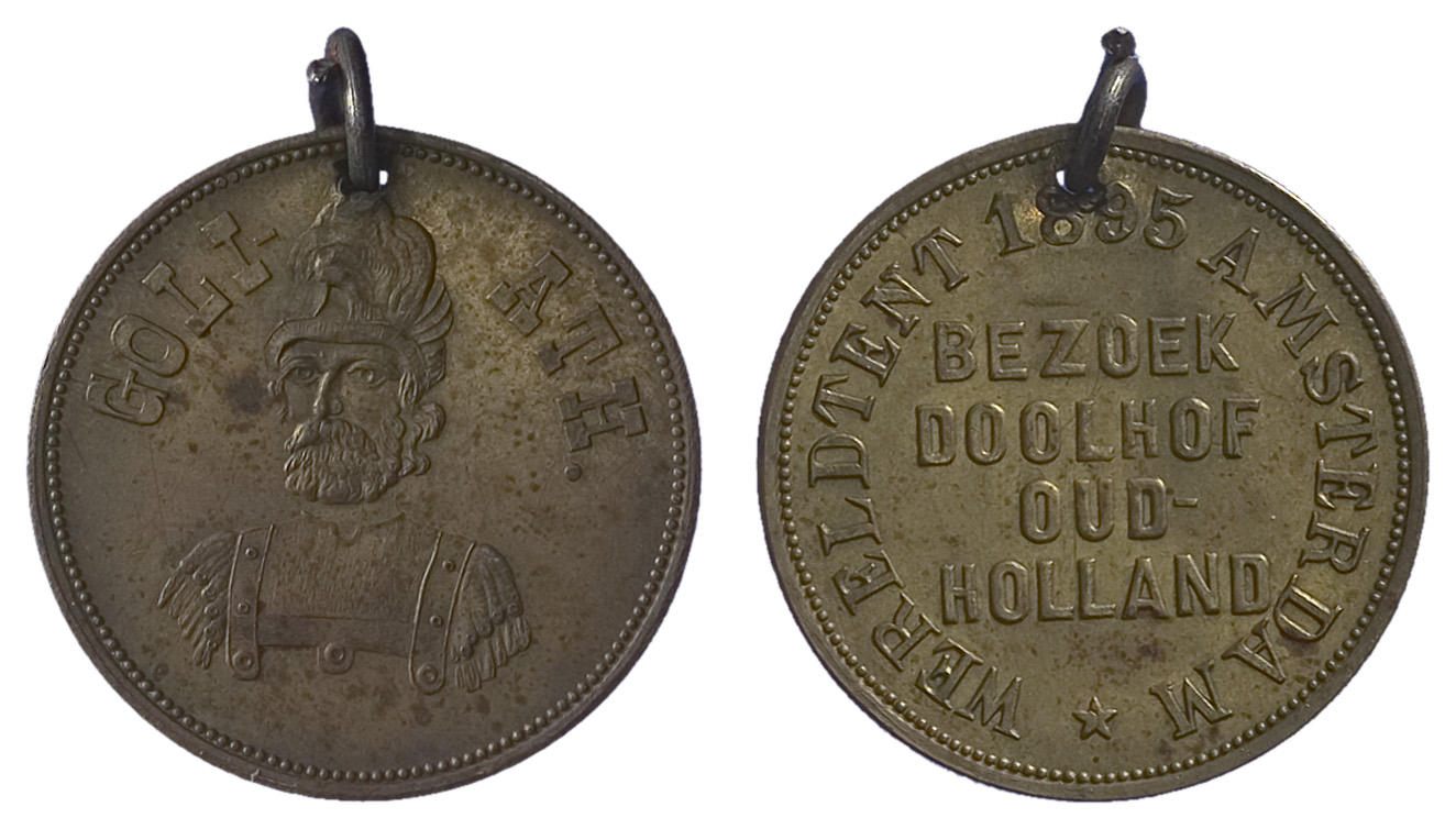 voorzijde: parelrand met omschrift. Borstbeeld van Goliath iets naar links.