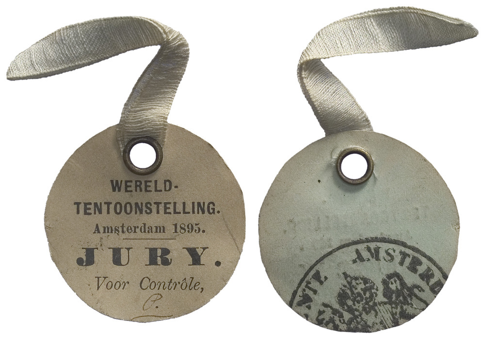 opschrift voorzijde: WERELD- / TENTOONSTELLING / Amsterdam 1895. / JURY / Voor Contrôle, / C.