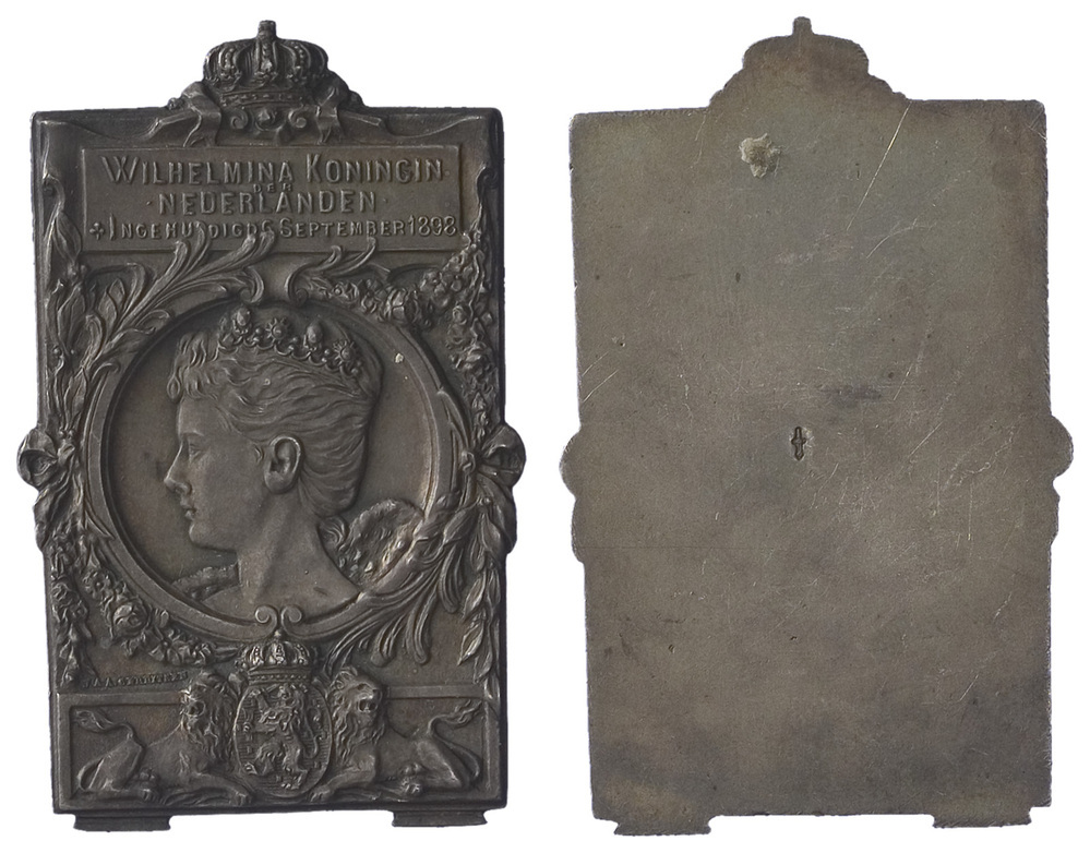 voorzijde: In een cirkel, gevat in door bloemslingers, palm- en lauwertakken een links gewend portret van koningin Wilhelmina met diadeem, en profile, omgeven door een hermelijnen mantel. Boven de cirkel een gekroond bord met opschrift. Onderaan de bijna rechthoekige penning in een cartouche het gekroonde wapen van Nederland, gehouden door twee liggende leeuwen. Links boven de cartouche een signatuur.