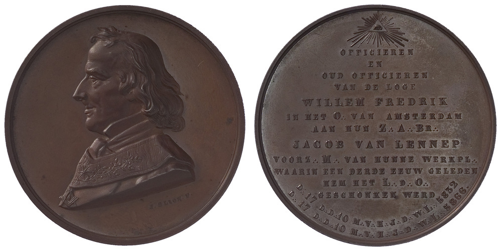 opschrift keerzijde: OFFICIEREN / EN / OUD OFFICIEREN / VAN DE LOGE / WILLEM FREDERIK / IN HET O:. VAN AMSTERDAM / AAN HUN Z:. A:. BR:. / JACOB VAN LENNEP / VOORZ:. M:. VAN HUNNE WERKPL:. / WAARIN EEN DERDE EEUW GELEDEN / HEM HET L:. D:. O:. / GESCHONKEN WERD