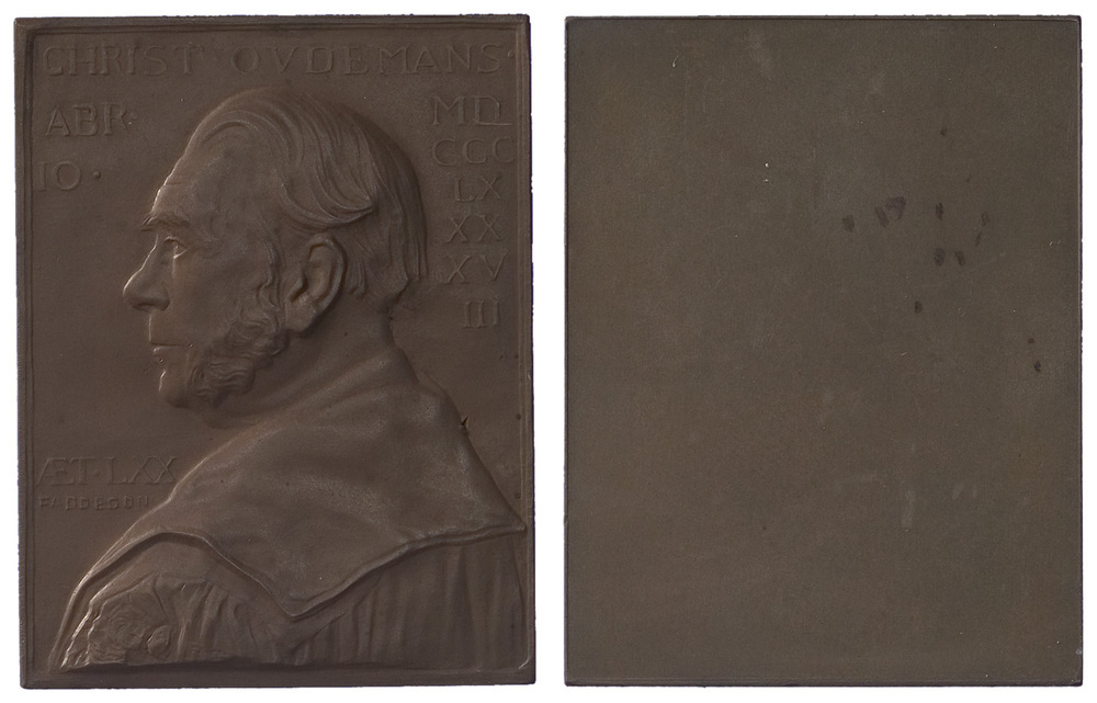 voorzijde: éénzijdige bronzen plaquette met het borstbeeld van J.A.C. Oudemans in toga naar links. Voorzien van opschrift en signatuur.- Trefwoorden