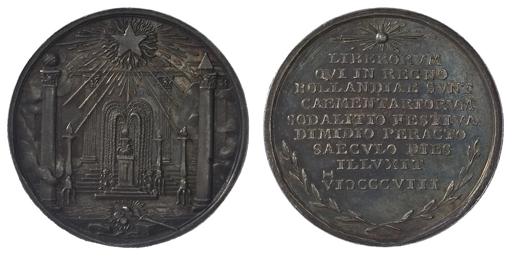 opschrift keerzijde: LIBERORVM / QVI IM REGNO / HOLLANDIAE SVNT / CAEMENTARIORVM / SODALITIO FESTIVA / DIMIDIO PERACTO / SAECVLO DIES / ILLVXIT / HVICCCCVIII