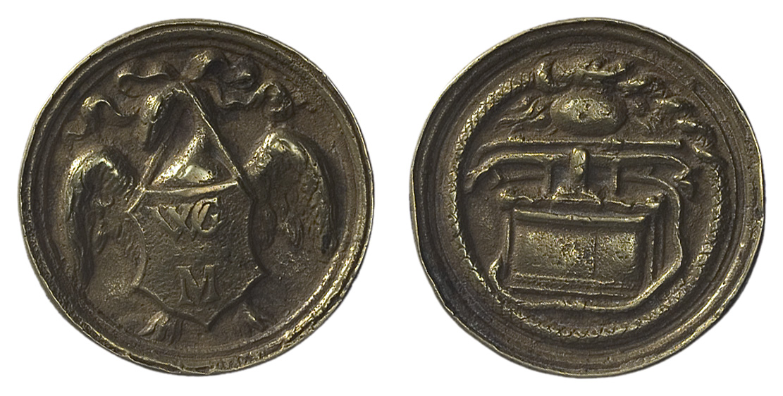 voorzijde: het wapen van de Watergraafsmeer in de vorm van een zwaan met wapenschild voor de borst, waarop de letters WGM. keerzijde: een afbeelding van een brandspuit omgeven door een Ouroboros. Boven de brandspuit een leeg ovaal.- Trefwoorden