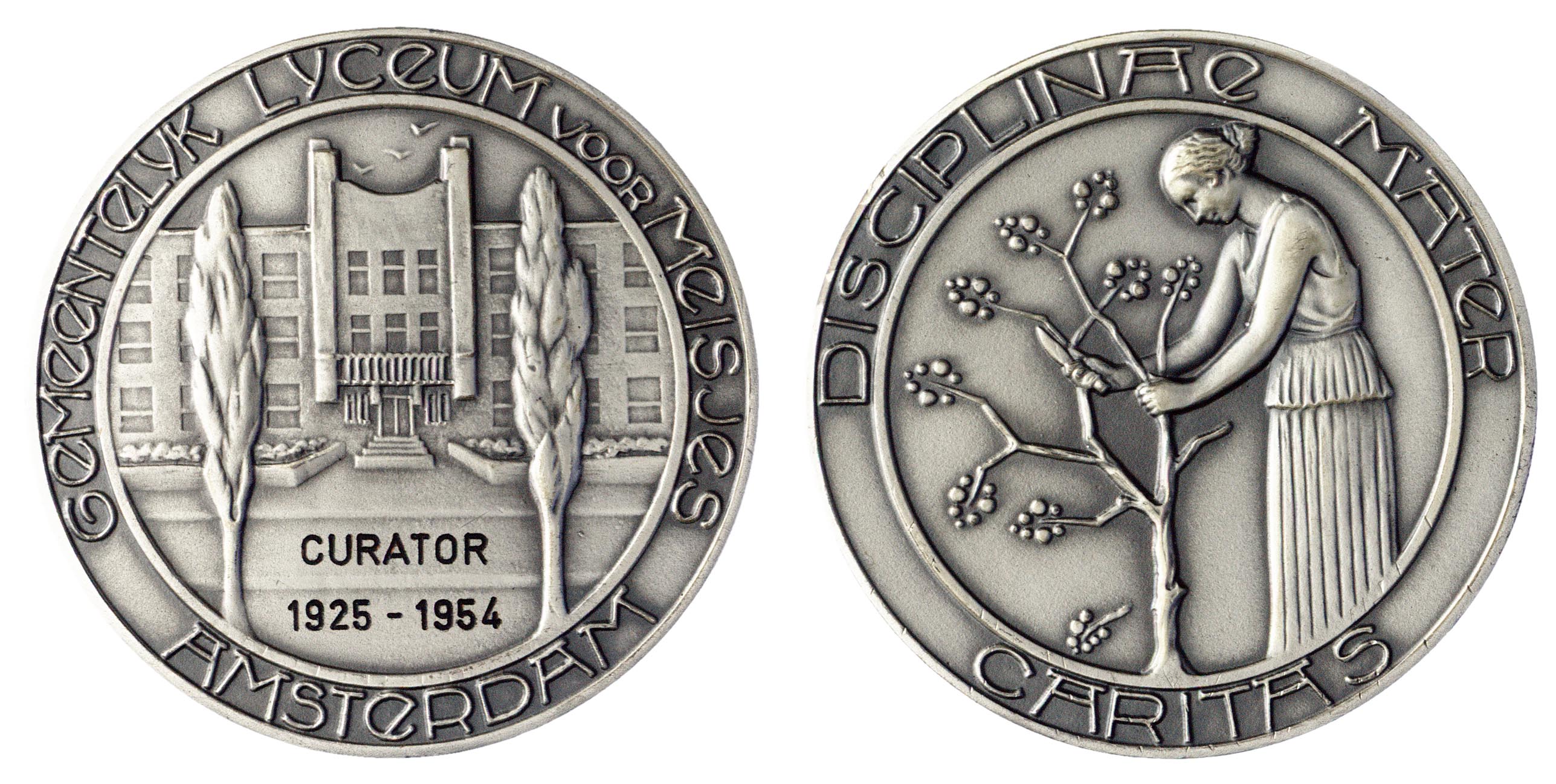 opschrift achterzijde tussen twee bomen: CURATOR / 1925-1954