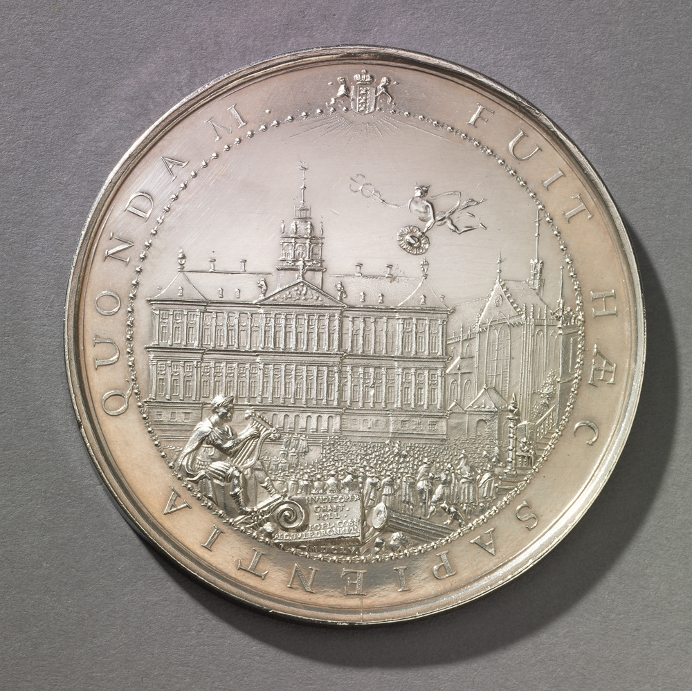 Voorzijde: het nieuwe stadhuis met rechts de Nieuwe Kerk. Op de Dam een mensenmenigte en feestelijke optocht. Linkervoorgrond Amphion met zijn lier, zittend op de resten van een ruïne; rechts daarvan een steen met daarop de namen van de vier burgemeesters en de twee thesauriërs in 1655, daarnaast een omgevallen sokkel en portretkop uit de oudheid. Op de sokkel staat een hond. In de lucht zweeft de handelsgod Mercurius met in zijn rechterhand zijn slangenstaf en in zijn linker de vrijheidshoed. Midden boven het stadswapen tussen twee leeuwen.