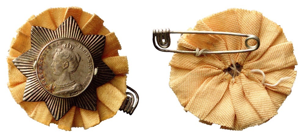 voorzijde: stervormig insigne op een oranje zijden rozet. In het midden een cirkel met omschrift waarbinnen het portret van Koningin Wilhelmina met kroon naar links met om haar hals een parelsnoer. keerzijde: een speld.