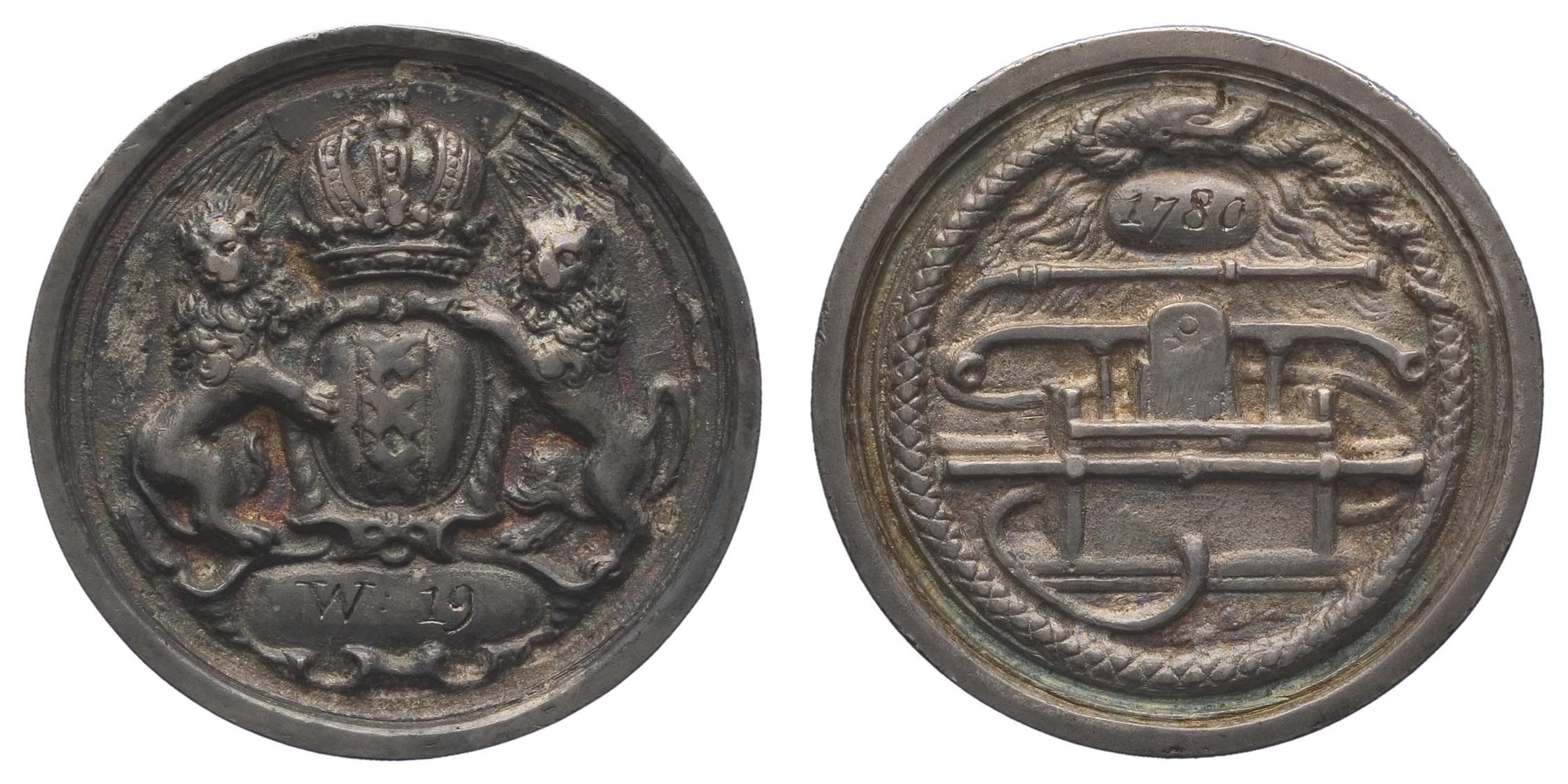 voorzijde: het gekroonde wapen van Amsterdam, gehouden door twee leeuwen. Onder het wapen een veld met W:19