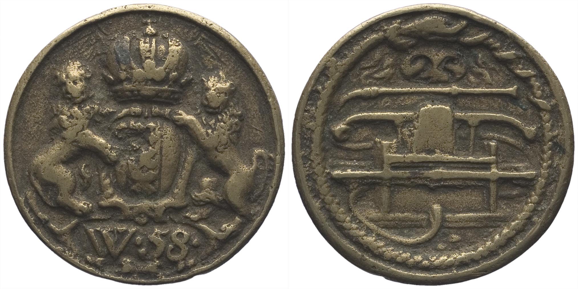 voorzijde: het gekroonde wapen van Amsterdam, gehouden door twee leeuwen. Onder het wapen een veld met W.58. Achter de kroon een stralende zon.