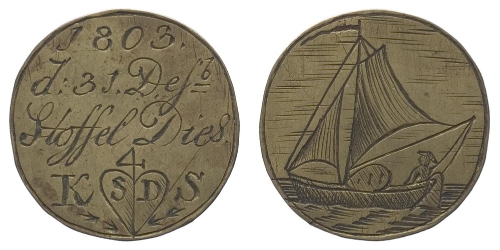 voorzijde: binnen een cirkelgroef een zeilscheepje met een wimpel naar links; een schipper bij het roer.