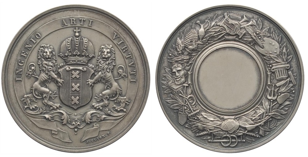 voorzijde: het gekroonde stadswapen van Amsterdam gehouden door twee leeuwen omgeven door een lint met opschrift. Onderaan een signatuur.