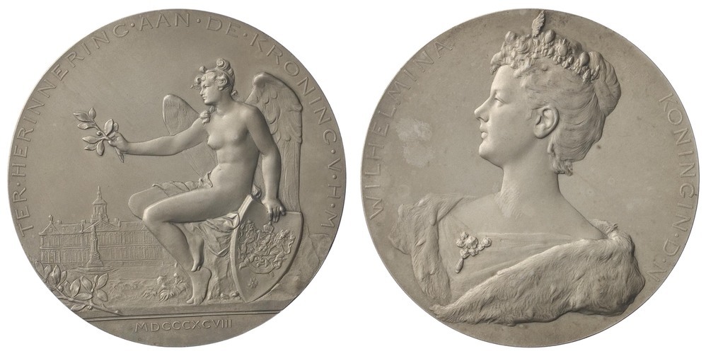keerzijde: gevleugeld vrijwel naakt vrouwenfiguur, zittend op rots naar links, in haar uitgestoken rechterhand een oranjetak, de linkerhand steunend op driehoekig schild, waarop het gekroonde wapen van Nederland gehouden door twee leeuwen. Op de achtergrond het Paleis op de Dam met het monument 'De Eendracht' of het 'Naatje', en links voor een lauwertak. In de afsnede een Romeins jaartal.