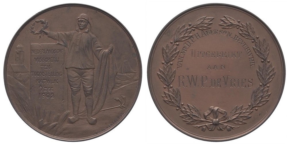 voorzijde: een visser en face op klompen en een zuidwester op het hoofd, met over de linkerarm een visnet en in de uitgestiken rechterhand een gestrikte lauwerkrans. Links op de penning een zuil met opschrift en links daarvan een kerk met koepel. Rechts op de penning een zeilend vissersschip en daaronder ankerhaken. Rechtsonder aan de rand een signatuur.