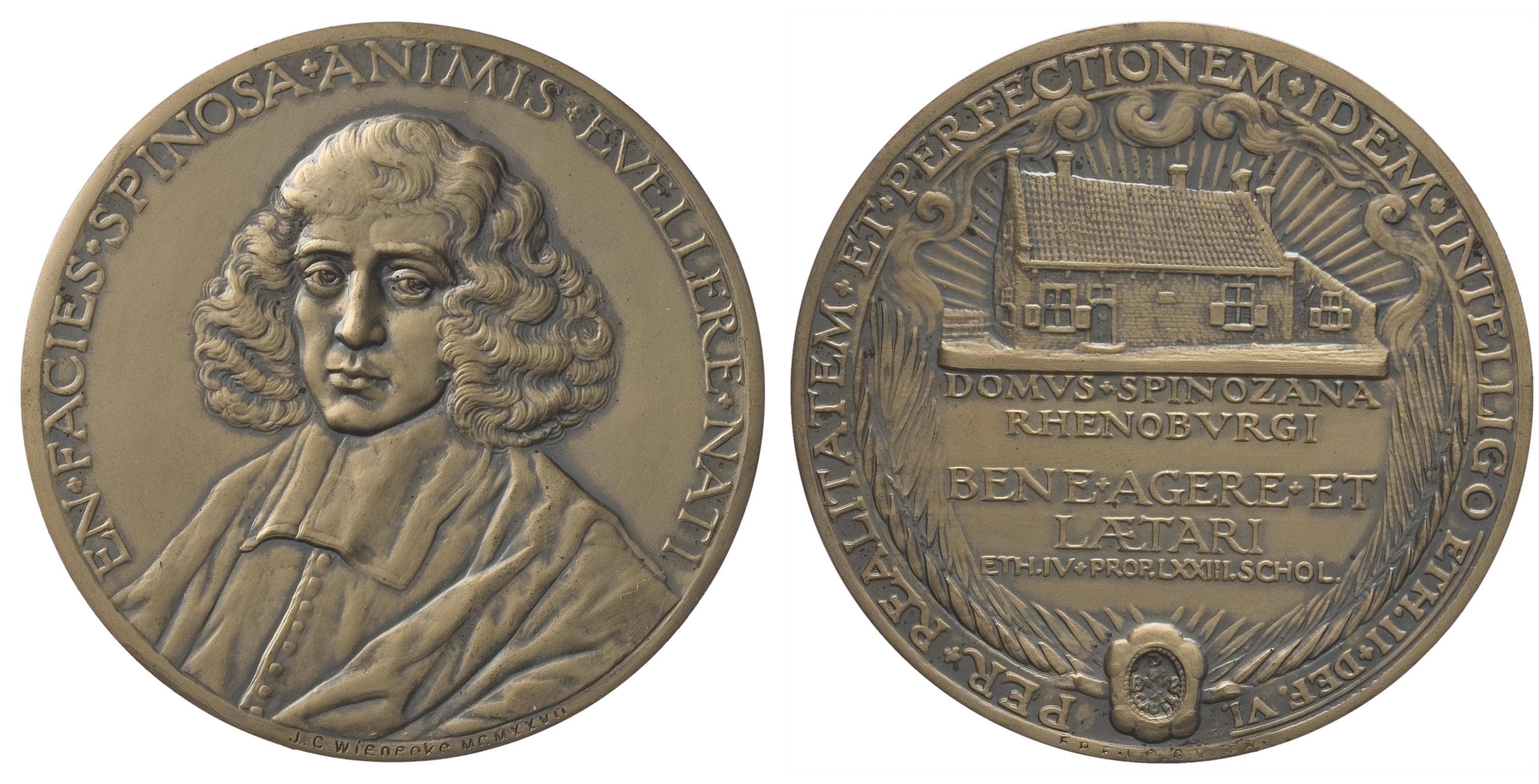 voorzijde: in een omschrift het borstbeeld van Baruch Spinoza met lang krullend haar en gekleed in toga, driekwart naar links gewend, en face. Onderaan op de rand een signatuur.