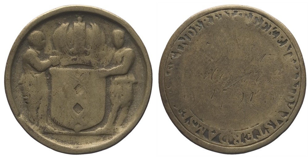 Penning van het Burgerweeshuis van Amsterdam, 1791 koper hoogte: 4.2 cm; breedte: 4.2 cm; diepte: 0.2 cm; gewicht: 14.10 gr;  omschrift keerzijde: TEEKEN VAN D'AMSTERDAMSE WEESKINDEREN