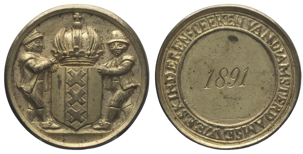 voorzijde: het gekroonde wapen van Amsterdam geflankeerd door twee weesjongens. keerzijde: een gegraveerd opschrift in een omschrift.- Trefwoorden