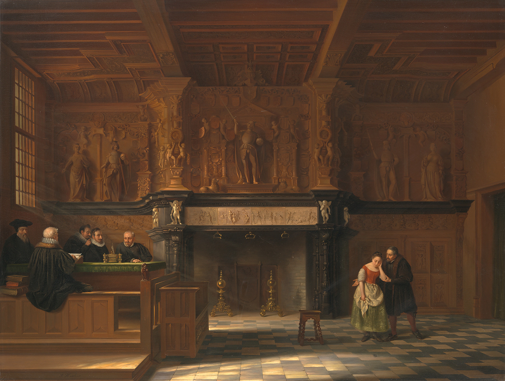 Zaal met tegelvloer en renaissance beeldhouwwerk boven de schouw in het midden. Links een college van vijf heren op tribune om een groene tafel. Rechts weeklagende vrouw, met zachte drang weggeleid door een heer. 16e-eeuwse voorstelling.